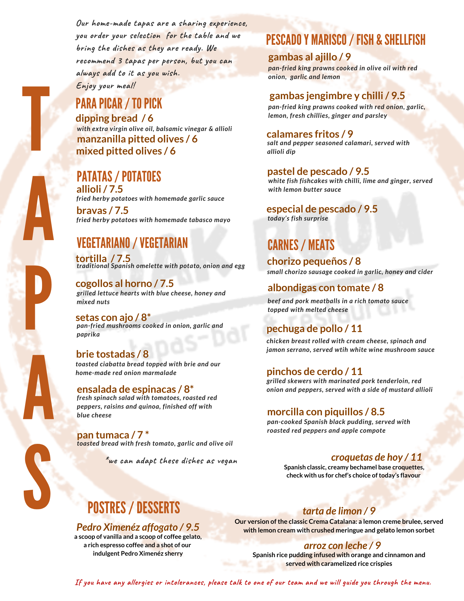 Combining modern and traditional tapas dishes. Sourcing local ingredients wherever possible and importing only the finest produce from Spain. Complemented by some amazing Spanish wines and spirits.